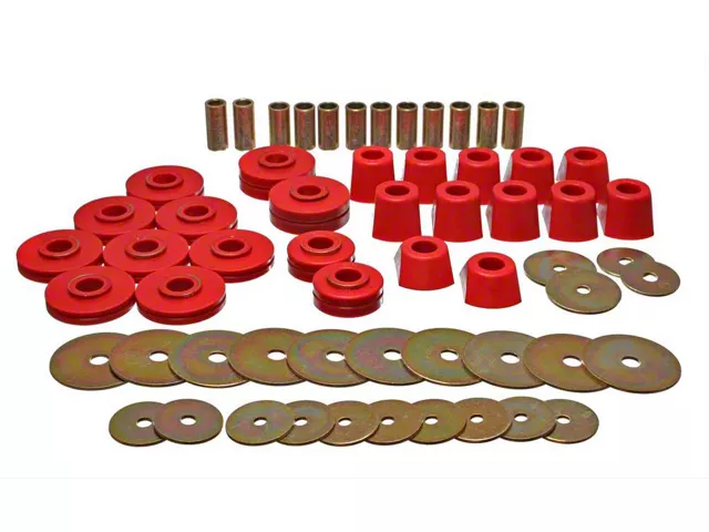 Energy Suspension's body mount kit will replace distorted and worn-out original rubber mounts to maintain truck cab to bed alignment. Original rubber mounts are so soft they often crack, distort, and crush so badly they often fall off. Aluminum body mounts are too harsh for street use that they tend to break and cause other components to break. Energy Suspension's specially formulated Hyper-Flex(r) polyurethane cab and body mounts combine the best qualities of both: they're soft enough for a smooth ride, yet rugged enough for the most demanding road or track. Most sets have a strong zinc plated steel ring molded into them for added durability and when the application requires it.