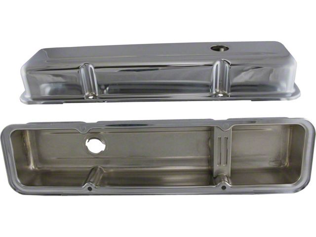 Construction and Appearance. With a polished chrome finish, these valve covers add a sleek, classic look to your engine bay while offering durability. The baffled design helps manage engine oil flow, reducing the risk of oil splash and ensuring efficient operation. Each cover includes a 1-1/4-inch hole, with one also featuring a twist-in hole for added convenience.