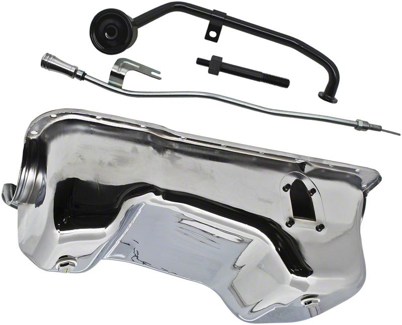 This dual-sump oil pan kit includes the major components you will need to install a 1969-97 351W Ford into your classic car or truck. This dual-sump oil pan design is often required for proper steering rack and crossmember clearance. Included is a 5qt capacity steel oil pan, oil pick up tube, oil dipstick and tube, as well as a main cap stud. Choose your style; the oil pan is available with a standard black finish, durable zinc plating, or bright chrome. Oil pan gasket and oil pan bolts are not included.