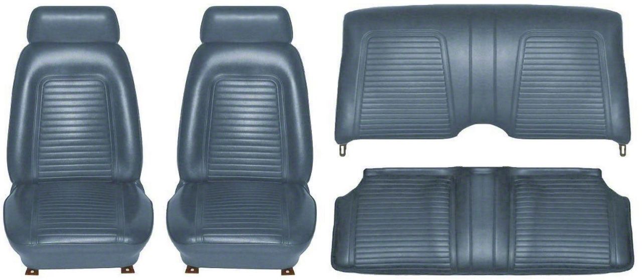 Construction and Appearance. Built with stock-style vinyl featuring the correct dielectric heat seal pattern, these seats are engineered to replicate the original texture and stitching-style impression that defines a proper restoration. The dark blue finish delivers a classic, rich tone that looks at home in a vintage interior while maintaining a uniform, factory-inspired presentation. Durable materials and consistent panel forming help the upholstery hold its shape through regular use, supporting long-term comfort and a refined, show-friendly look.
