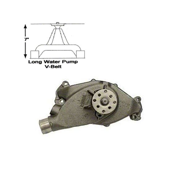 Chevy Camaro mechanical short style water pumps measure 5-5/8” high from the shaft down with the pilot shaft diameter measuring 5/8". Long style Chevy Camaro water pumps measure 7” high from the shaft down, and the pilot shaft diameter was 5/8" as well. Do not mix and match pulleys from short and long water pump engines because this will cause pulley misalignment. An easy way to find out what style you have while your pump is still installed on the motor is to try to stick your hand between the water pump and timing chain c