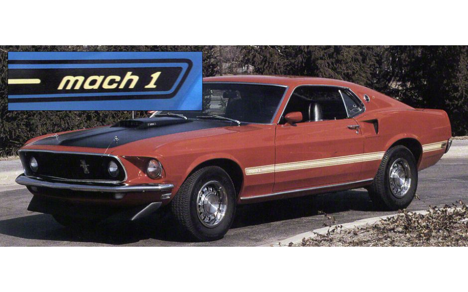 1969 Mustang Mach 1 Side & Trunk Stripe Kit - Reflective kit restores car back to original appearance, Two color stripe kit includes stripes for fenders doors and rear quarters before and after wheel wells. Mach 1 name on fenders. Kit does both sides of car and trunk.