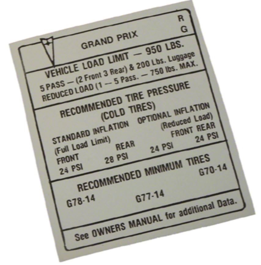 Door Jamb Tire Pressure Decal (1969 GTO)