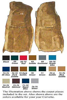 Carpet and jute padding are press molded at the same time, providing accurate contours for a perfect fit. All sets are made with the correct molded heel, pad, dimmer switch and vinyl edge bindings. 1968-76 Corvettes with vinyl interiors and 1968-69 with leather interiors were equipped with 80/20 loop carpet.