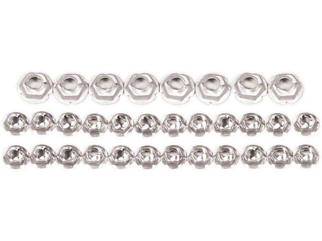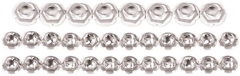 Construction and Appearance. Each piece in this 32-piece kit is crafted with a polished chrome finish, offering both durability and a sleek appearance. These speed nuts are designed to ensure a secure fit, making hardware installation faster and more efficient while maintaining the classic look of your vehicle.