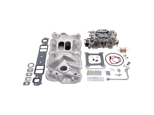 The Edelbrock #2021 Single-Quad Manifold and carb kit is designed for 1957-86 Small-Block Chevy applications. With a Manifold and Carb Kit, it’s easy to upgrade your induction system with the best combination of Edelbrock proven performance and looks in a single box. These kits include: an Edelbrock manifold, Performer or Thunder Series AVS carb, chrome fuel inlet, intake gasket set, intake bolt set and carb stud kit. The manifold and carbs are available with a standard satin finish or with our bright EnduraShine chrome-like finish for long lasting show quality looks.