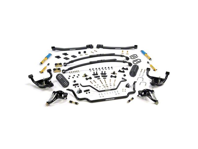 Hotchkis Sport Suspension 80017-2 Stage 2 TVS Kit Extreme with 2 in. drop for 1970-1973 Camaro and Firebird Coupes with Small Block motors. Includes Adjustable Rear Sway Bars 1 3/8 in. Front and 7/8 in. in rear with Chassis Max Sway Bar Brace 2 in. Lowered Sport Springs 1.5 in. Lowered Leaf Springs, and Front and Rear Hotchkis Tuned/FOXShocks Sub Frame Connectors (Chassis Max Brace Also Included on Convertible Kits) all necessary Hardware and Bushings with Heavy Duty Tie Rod Sleeves also included. One Convenient Kit for the ultimate handling GM F-Body Camaro or Firebird nothing beats the Hotchkis Sport Suspension Stage 2 Total Vehicle System. This kit has been rigorously designed and tested on the track yet is very comfortable for your local cruise in. Every aspect of the suspension has