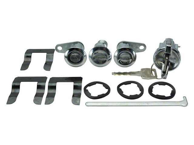 This set contains 1 ignition key cylinder, 1 trunk lock cylinder, and 2 door lock cylinders all keyed the same. Includes 2 keys.