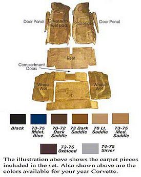 Carpet and jute padding are press molded at the same time, providing accurate contours for a perfect fit. All sets are made with the correct molded heel, pad, dimmer switch and vinyl edge bindings. 1970-77 with leather interiors were equipped with cut-pile carpet