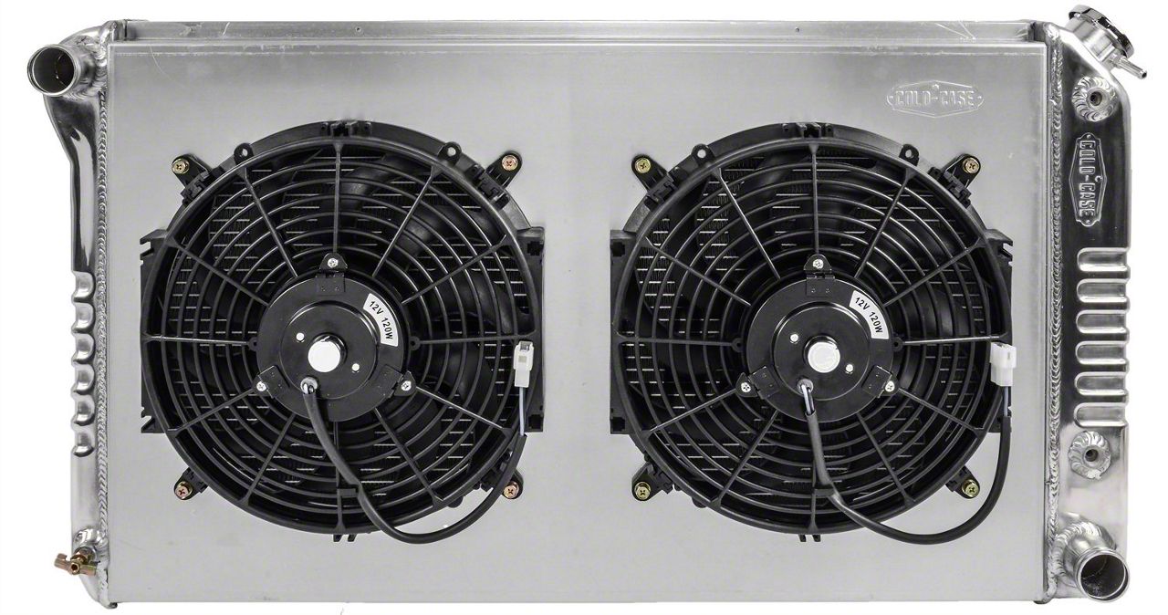 Eckler's is proud to offer this quality all aluminum radiator with dual electric fan kit by COLD-CASE at an affordable price compared to other high price aluminum radiator/fan kits on the market. This radiator is an exact fit (not a universal replacement), replaces your original copper/brass radiator, and will cool like a modern car! COLD-CASE radiators are TIG welded 100% aluminum and absolutely beautiful! You don't need to buy a 3 or 4 row aluminum radiator! They doesn't cool as well as this oversize 2 row model. COLD-CASE aluminum radiators are 50-75% lighter than factory copper and brass radiator units and cool up to 40% better. Plus, the incredible price makes this radiator/fan kit an exceptional value