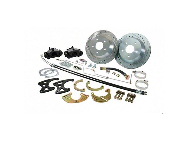 .CPP's system uses a 12” cross-drilled, gas slotted and zinc washed rotor that mounts to the factory axle with the longer studs supplied, and mates up to a Lincoln Continental emergency brake style caliper mounted to the rear axle housing with a CPP custom caliper mounting bracket. Includes all the rotors, calipers, brake lines, brackets, cables, hoses, clips, instructions and necessary hardware to assure a hassle-free installation. This kit requires larger diameter disc brake type 16” wheels. . These kits work with original rear end