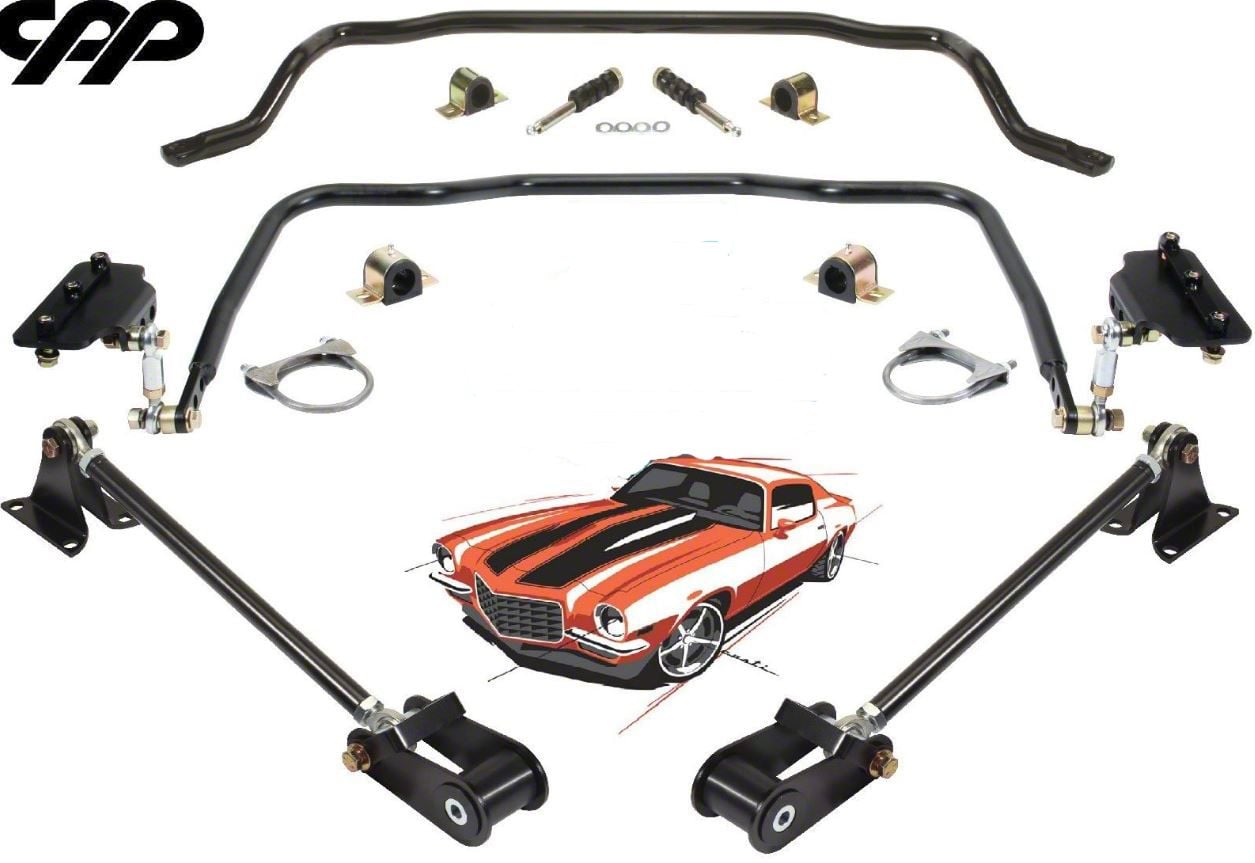 . This CPP traction bar/sway bar handling kit is a simple way to quickly upgrade the handling characteristics of your second generation Camaro or Firebird. The newest addition to CPP's suspension lineup, our CPP Traction Bar kit for 70-81 F-body Camaro and Firebird will work with mono, multi-leaf, & narrow leaf springs and includes new "D"-Spec front spring bushings, the same bushings we use in our Totally Tubular™ Control Arms. We have re-engineered the forward pivot area to be more efficient at transferring loads from the axle to the chassis, putting less stress through the spring while optimizing weight transfer, and the point where the linkage contacts the spring is a wider flat surface, reducing stress on the top of the leaf spr