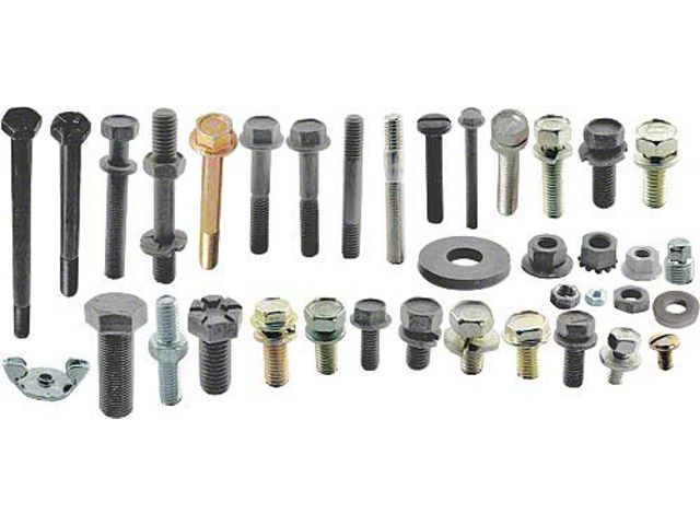 Engine hardware master kits include OEM style hardware to attach the following items: Air Cleaner, Exhaust Manifolds, Oil Filter Adapter, Carburetor, Fuel Pump, Oil Pan, Crankshaft Pulley, Heat Shroud, Timing Cover, Distributor, Ignition Coil, Valve Covers, Engine Tag, Intake Manifold, Water Neck & Water Pump.
