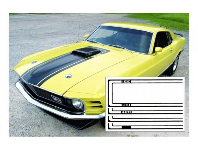 1970 Mustang Mach 1 Shaker Hood Paint Stencil - Choose 4 Styles .Does the entire center of hood and wraps around shaker at the windshield. Stripes with or without designations available 351, 428, blank or open.