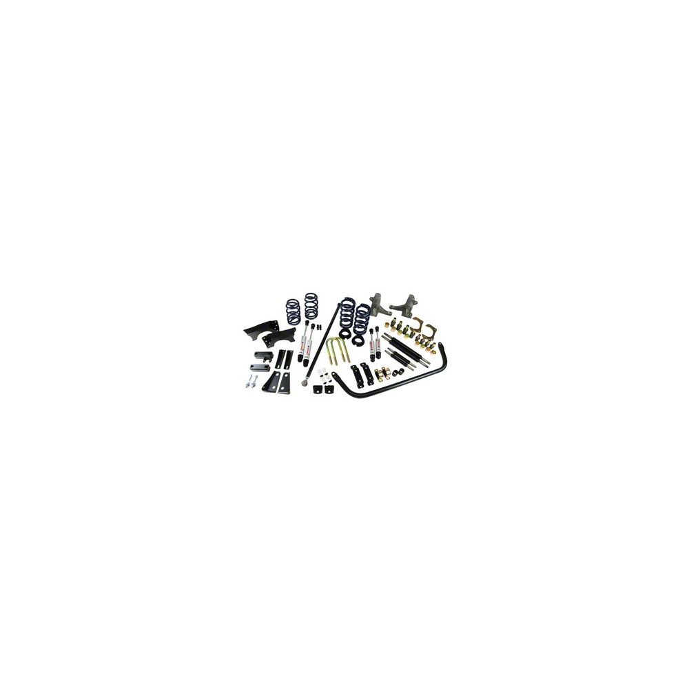 - Includes Front Coil Springs, Front Sway Bar, Drop Spindles, Delrin Control Arm Bushings, Front and Rear HQ Series Shocks, Dual Rate Rear Springs, C-Notches, Full Lenght Adjustable Panhard Bar & Lowering Blocks