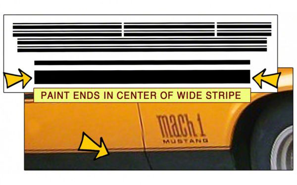 1971-73 Mustang or Boss Mustang Lower Paint Break Stripe Kit - Dual stripe has wide stripe and 1/4" pinstripe and installs over paint seam on the lower side of the body. Kit does both sides of the car.