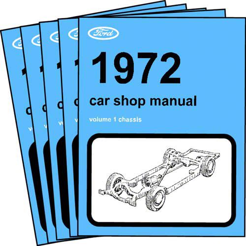 The 1969-1973 shop manuals were published as 5-volume sets, listing all Ford Motor Company products for the model year. Technical illustrations and diagrams are provided for chassis, engine, electrical, body components, and pre-delivery service.