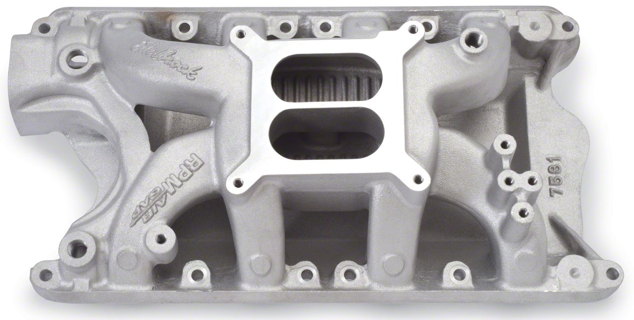 Based on performer RPM-series with unique air gap. Air gap cooler and denser mixture for more power. Designed for 1500 to 6500 RPM. Improve performance on the street or race track.Larger cross-sectional area and taller card flange. Compatibility with large displacement 351W based engines. For 4 bbl carbs. Available in cast, polished and endurashine finish.