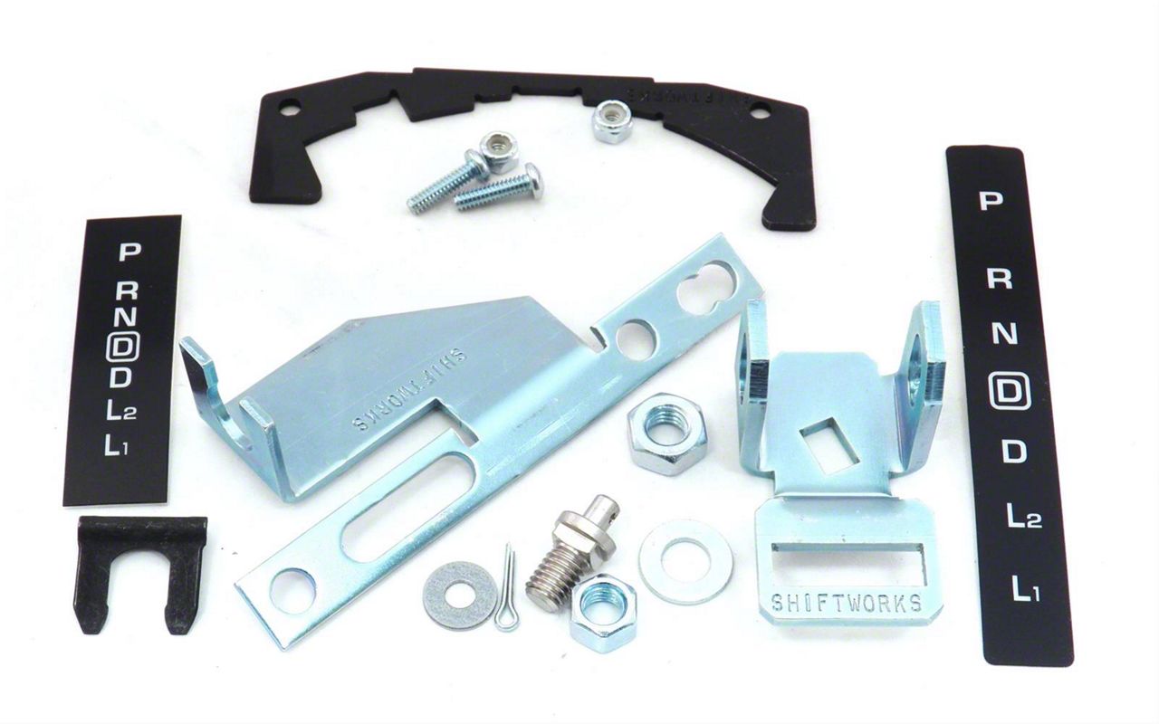 Materials And Design. The kit includes a transmission cable bracket, transmission shift lever, shifter detent (except for 6L80E and 6L90E kits), dash and console gear indicator adapters (also except for 6L80E and 6L90E kits), and a hardware kit. All components are engineered for durability and precise fitment, manufactured with high-quality materials to ensure long-lasting performance and an accurate shifting feel while maintaining the factory appearance of the vehicle’s interior.