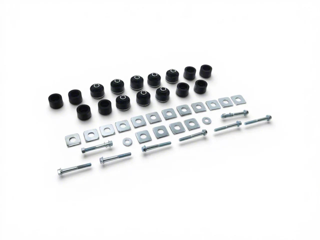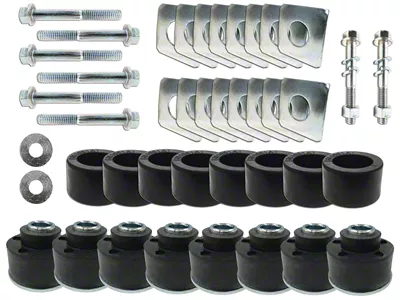 Construction and Appearance. Each component in the Body Mount Bushing Kit is crafted from high-grade rubber, ensuring excellent durability and performance. The bushings are injection molded with molded inserts to provide a precise fit and superior strength. The kit also includes stock style forged bolts that are Grade 5, offering enhanced strength and reliability. The matte black and raw metal finish gives the components a sleek and professional appearance, matching the original parts' look and feel.