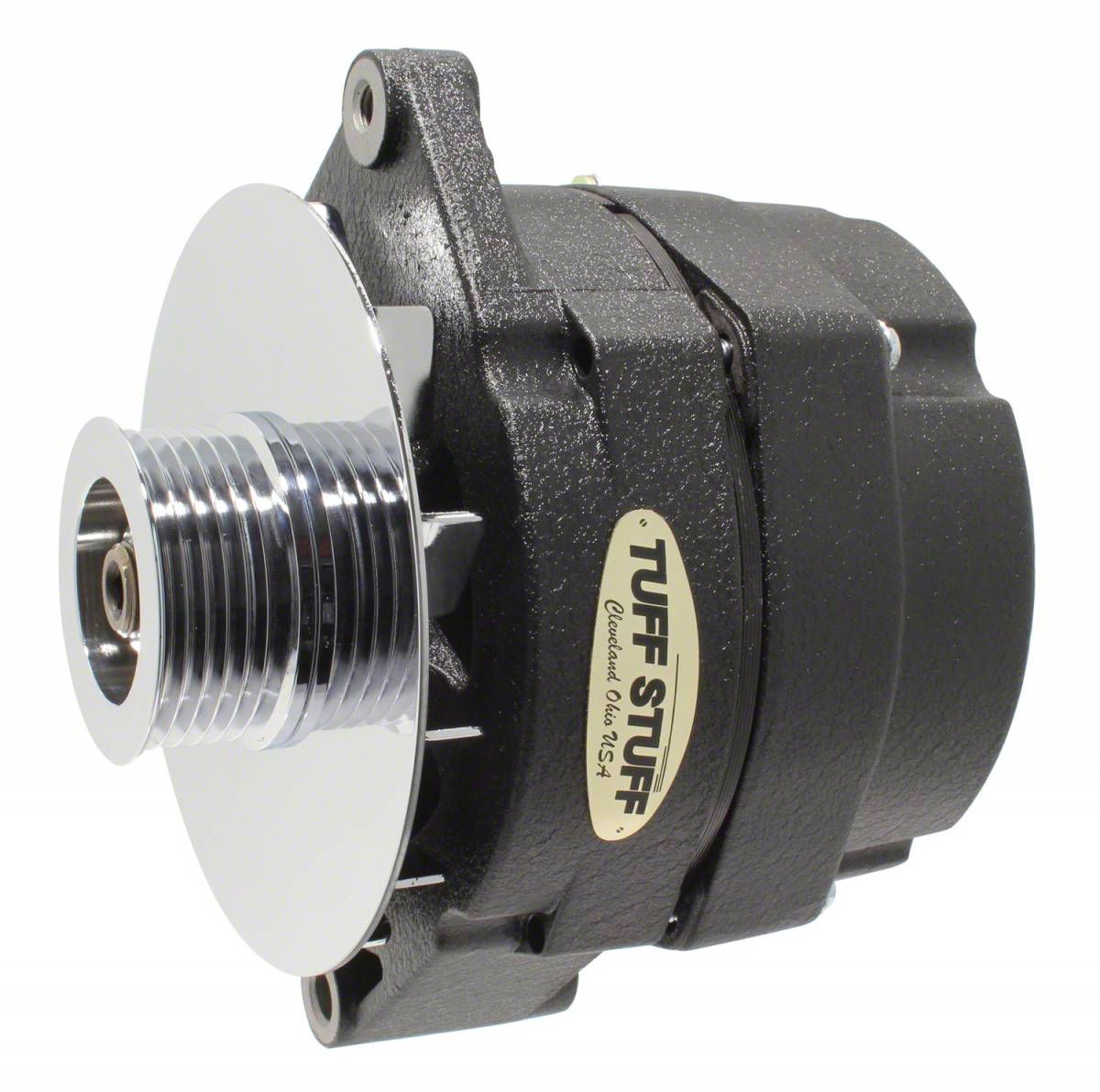 All Tuff Stuff alternators are hand built in Cleveland, Ohio and are tested to meet or exceed OEM specifications. All Tuff Stuff alternators are made from 100% new components and carry a one year limited warranty. Tuff Stuff has alternator applications for virtually all muscle cars, hot rods, customs and light trucks in just about every finish imaginable. Available in chrome plated, polished aluminum, powder