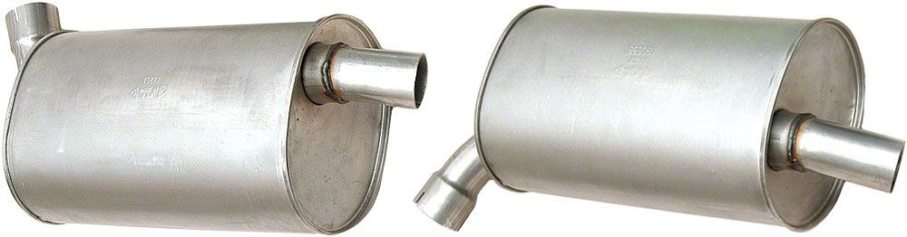 Construction and Appearance. Each muffler is crafted from 2-1/2-inch aluminized steel tubing, offering a balance of strength, durability, and corrosion resistance. The raw metal finish retains an authentic, utilitarian appearance that blends well with vintage underbody components. Their simple yet sturdy design ensures longevity even under harsh conditions.