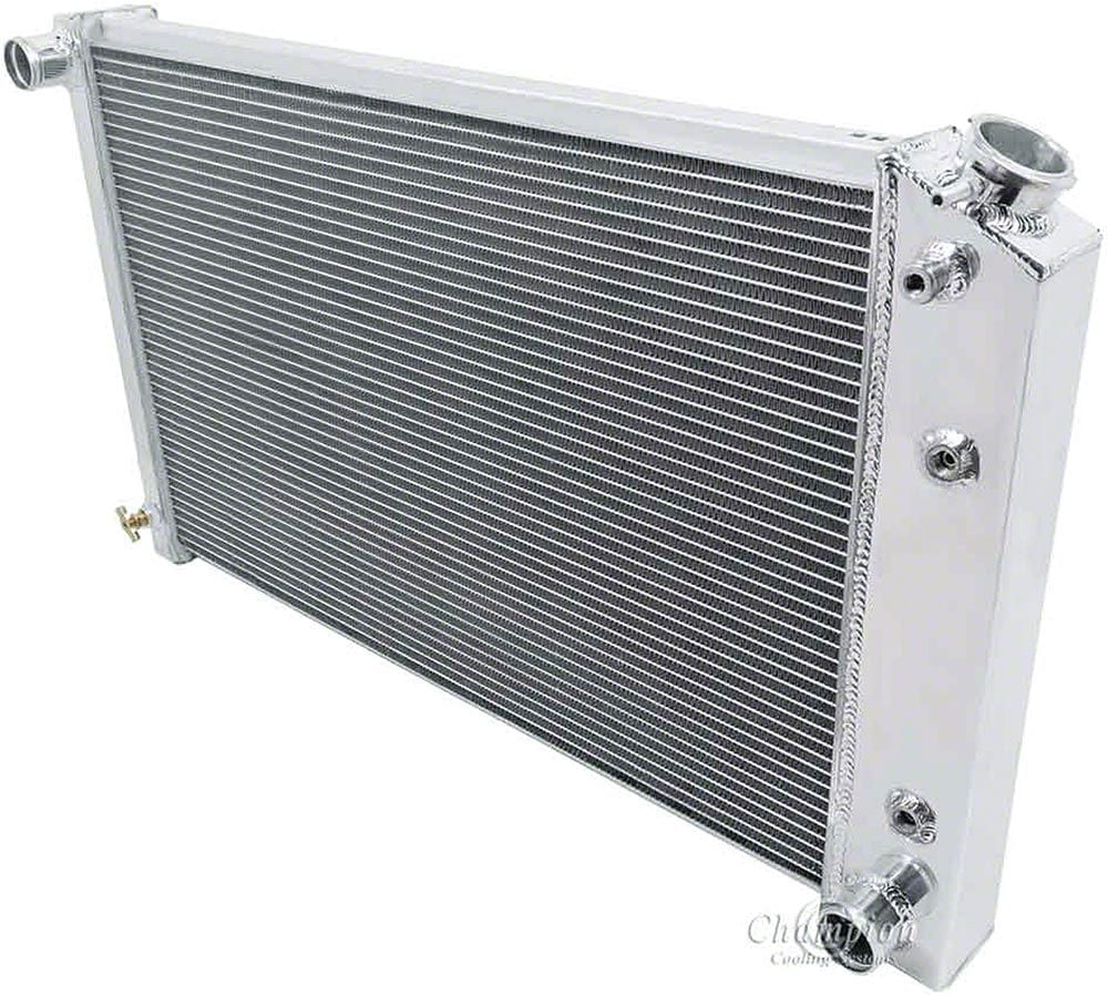 Your 1975, 1976, 1977, 1978 or 1979 Nova can get hot...really hot. Bumper to bumper traffic, blistering summer days, and daily driving can add up. The factory copper and brass radiators were barely satisfactory at transferring heat which is why Chevy engines will overheat. Why take chances with your valuable Chevy engine? Champion Aluminum Radiators from Eckler's Nova provide outstanding perofrmance at an excetional value. Aluminum is a far superior to the original copper and brass because it dissipates heat and cools down much more quickly. That means better protection for your investment. Champion's aluminum radiator is 50-75% lighter than your factory copper and brass radiator unit and cools up to 40% better. Plus, the the incredible price makes this Champion radiator an exceptional va