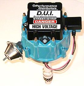 Construction and Appearance. Crafted with high-quality materials, this distributor features a 50,000-volt D.U.I. coil, a high-output Dyna-module, and a brass terminal cap for reliable performance. Its durable construction and polished finish make it both functional and visually appealing.