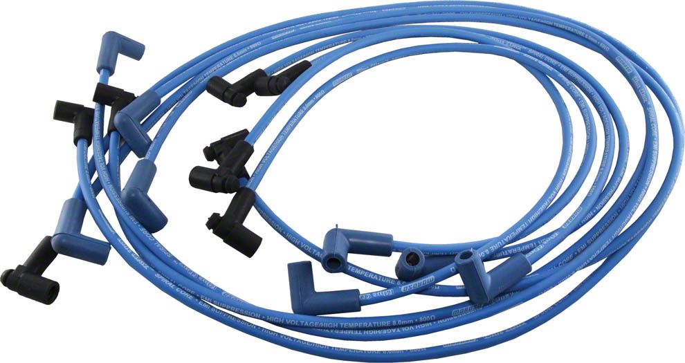 Construction and Appearance. Featuring a dark blue finish, these spark plug wires use an 8mm spiral core design that is compatible with headers. The high-quality materials and construction ensure durable performance and reliable ignition, making them suitable for high-performance driving conditions.
