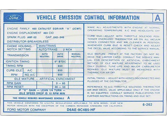 Emissions Decal, 460 V8 (1976 Ford Thunderbird)