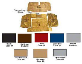 Carpet and jute padding are press molded at the same time, providing accurate contours for a perfect fit. All sets are made with the correct molded heel, pad, dimmer switch and vinyl edge bindings.