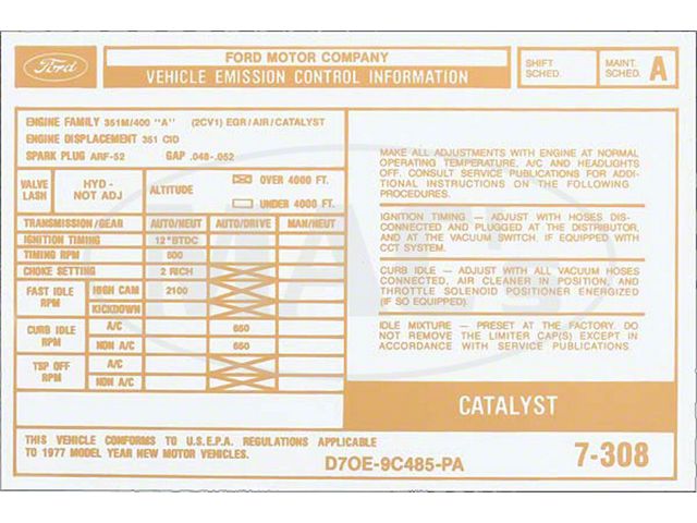 Emissions Decal, 351W with Automatic Transmission (1977 Ford Thunderbird)