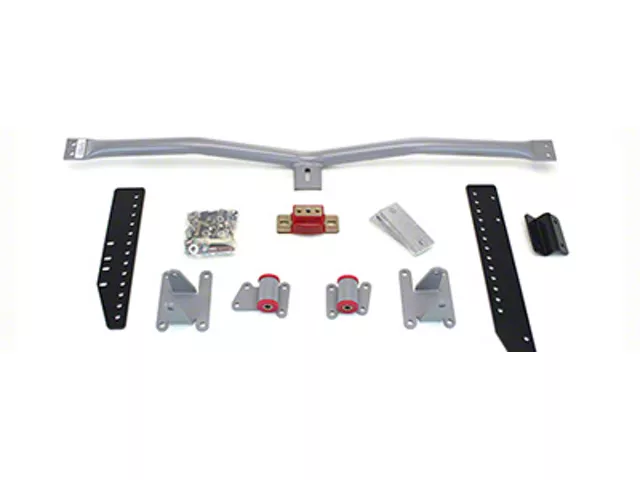 Frame mounts and transmission crossmember bolt-in to factory mounting holes, requiring no drilling or modifications