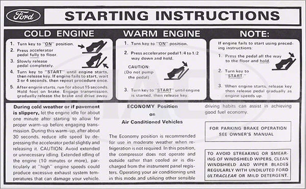 1978 Thunderbird Sun Visor Sleeve, Starting and Seat Belt Instructions
