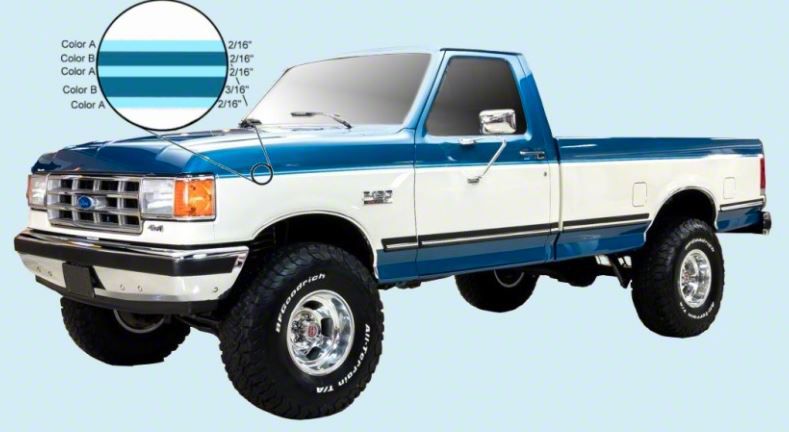Bold graphics were the rage in the late 80s. Problem is, vinyl stripes crack and peel over time leaving you stuck with painting your truck to get rid of them. Mac's offers an array of graphics that perfectly mimic the originals, like our Tu-tone decal kit. This OEM style kit is patterned from an original kit and features the correct muticolored patterns. Manufactured with high performance automotive grade premium 2mil cast vinyl. Bring your Ford pickup back to its former glory with a side stripe kit from Mac's.