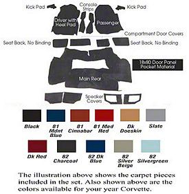 Application. This Cut-Pile Carpet Set fits 1981-1982 Chevrolet Corvette C3 models. It is ideal for Corvette owners looking to restore their vehicle's interior to its original factory appearance with a high-quality reproduction carpet set.