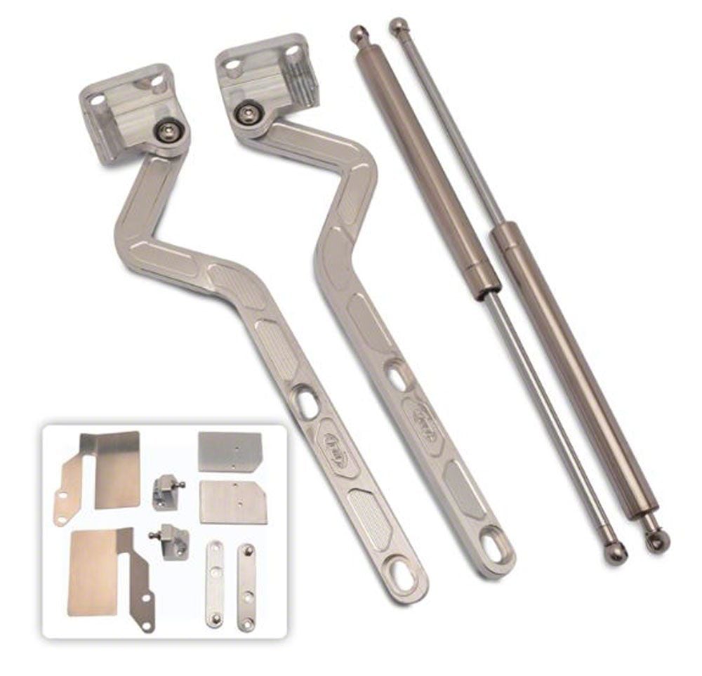 Whether you are looking for the ultimate in under-hood customizing or just want to replace your weak stamped-steel stock hood hinges, Eddie Motorsports hinges from Eckler’s are the answer. The hinges are CNC machined from solid chunks of 6061-T6 billet aluminum in the USA. Stainless steel nitrogen struts are utilized instead of springs and sealed ball bearings are utilized at all pivot points for smooth operation. for reliable operation. Designed as direct fit, “bolt on” units, the hinges utilize the stock mounting holes with elongated slots for ease of gap adjustment.