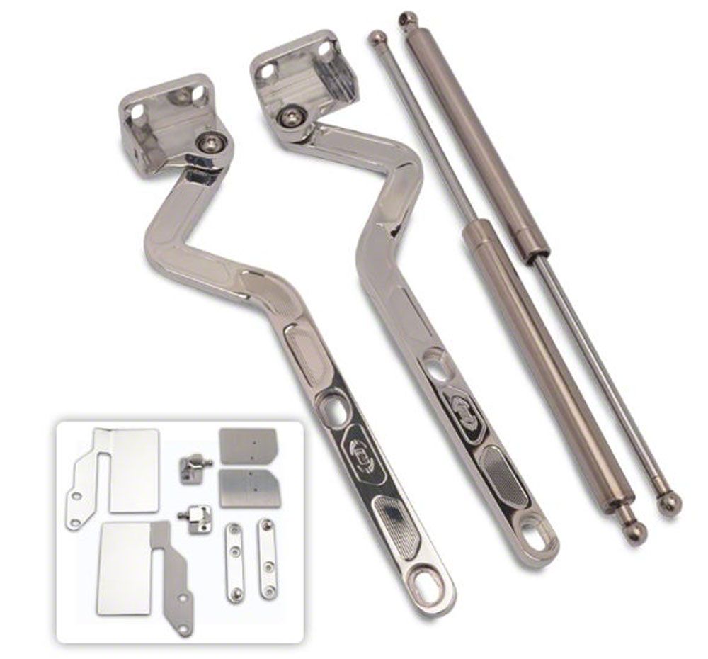 Whether you are looking for the ultimate in under-hood customizing or just want to replace your weak stamped-steel stock hood hinges, Eddie Motorsports hinges from Eckler’s are the answer. The hinges are CNC machined from solid chunks of 6061-T6 billet aluminum in the USA. Stainless steel nitrogen struts are utilized instead of springs and sealed ball bearings are utilized at all pivot points for smooth operation. for reliable operation. Designed as direct fit, “bolt on” units, the hinges utilize the stock mounting holes with elongated slots for ease of gap adjustment.