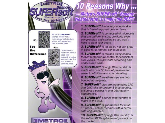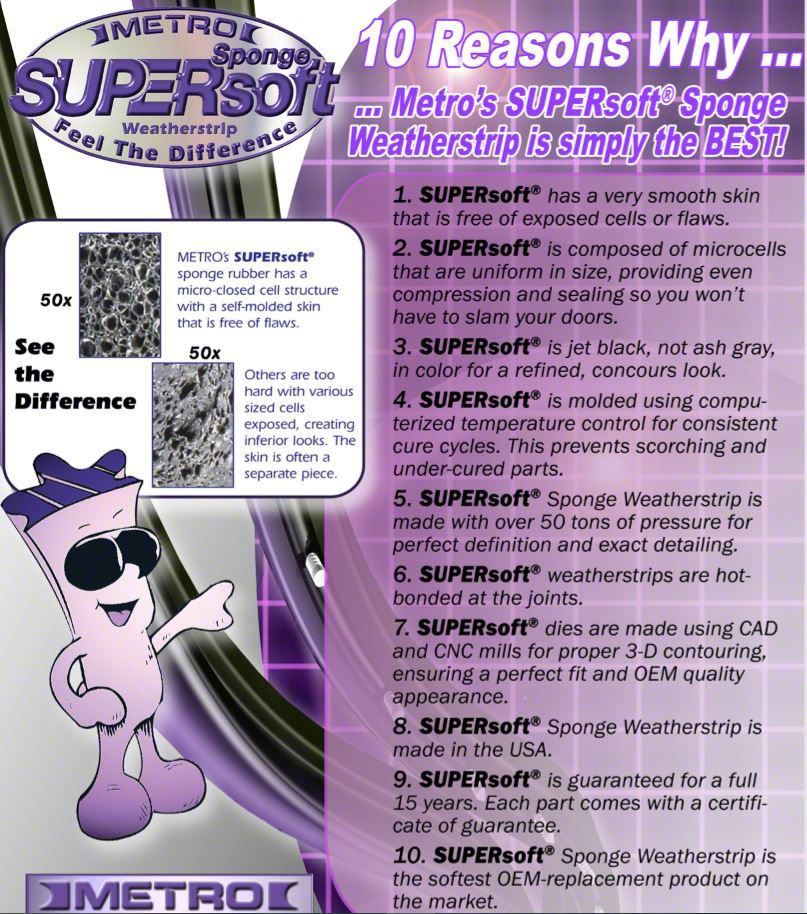 The brand chosen by professional automobile restorers for many years, Metro SUPERsoft® EPDM sponge rubber delivers on its name! It’s up to 35% softer than other brands while performing far better than competitive products and lasting years longer. Due to its unmatched softness and pliability, SUPERsoft® brand sponge rubber weatherstrip and seals are easier to install and fit better than other products. You won’t have to slam your doors or trunk with SUPERsoft® Sponge weatherstrip installed on your car! SUPERsoft® brand sponge is also the best looking weatherstrip available anywhere with a high gloss, smooth black skin that gives a refined Concours appearance. In addition, SUPERsoft® brand sponge rubber provides extraordinary resistance to hardening and de