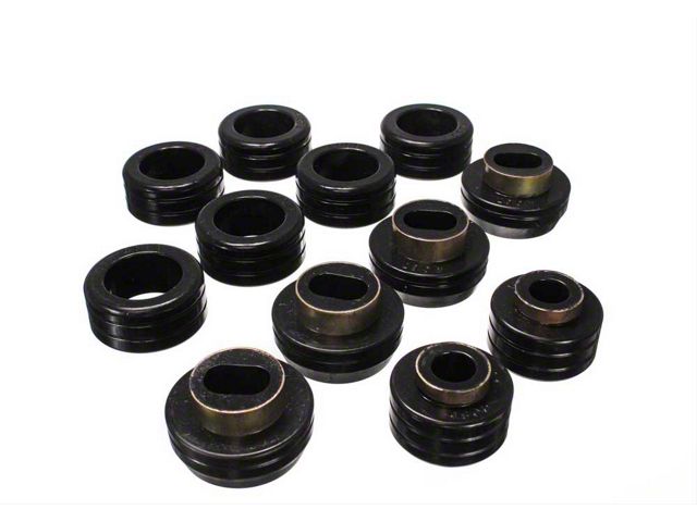 Energy Suspension's body mount kit will replace distorted and worn-out original rubber mounts to maintain truck cab to bed alignment. Original rubber mounts are so soft they often crack, distort, and crush so badly they often fall off. Aluminum body mounts are too harsh for street use that they tend to break and cause other components to break. Energy Suspension's specially formulated Hyper-Flex(r) polyurethane cab and body mounts combine the best qualities of both: they're soft enough for a smooth ride, yet rugged enough for the most demanding road or track. Most sets have a strong zinc plated steel ring molded into them for added durability and when the application requires it.