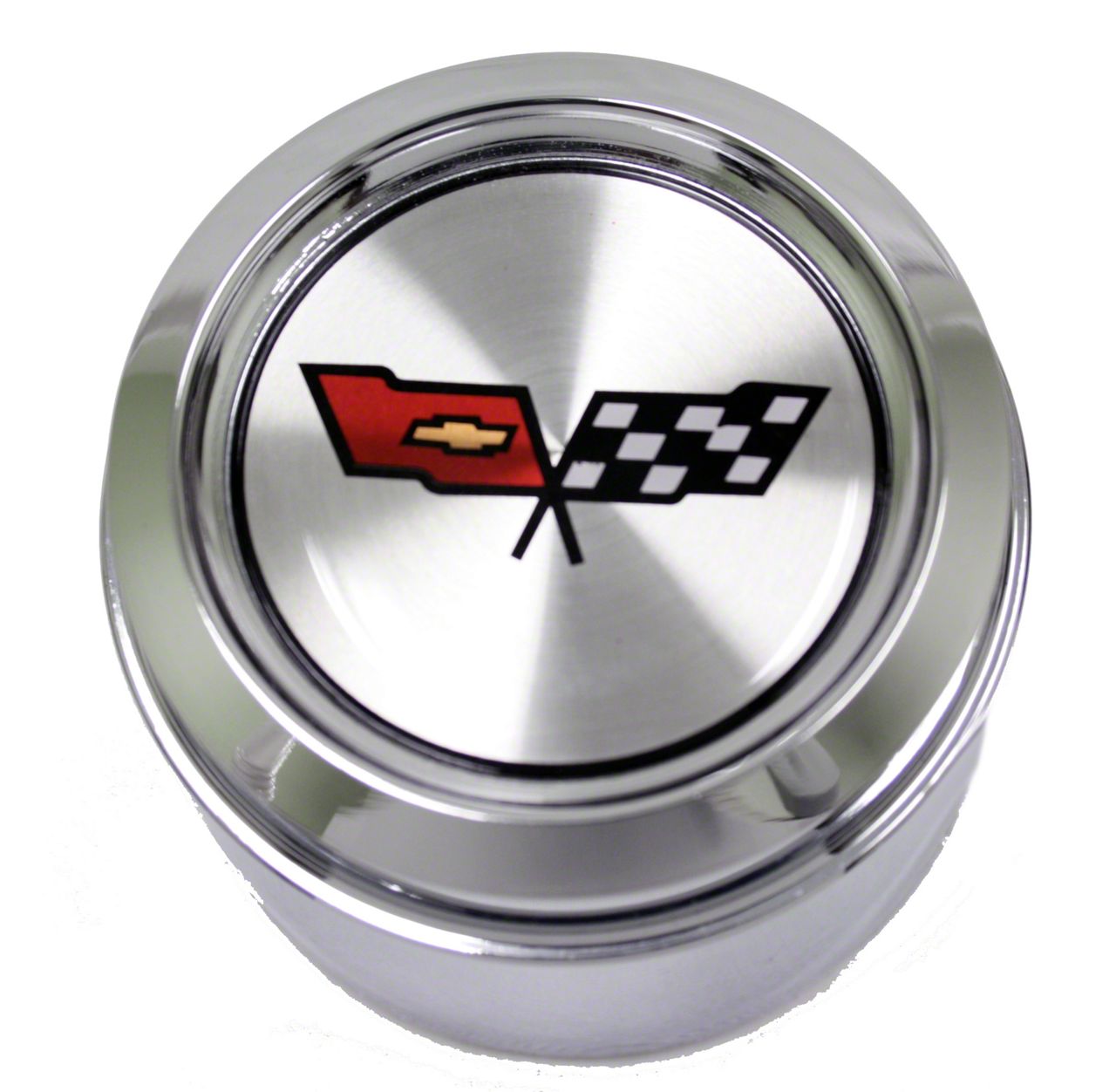 Construction and Appearance. This wheel center cap is crafted from high-quality aluminum, providing excellent strength and a lightweight design. The polished chrome finish adds a sleek and shiny look to your wheels, while the Corvette crossed flag emblem design showcases the classic Corvette branding. Built to stock specifications using modern techniques, this cap ensures an authentic appearance and reliable performance.