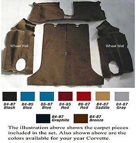 Application. This Auto Custom Carpet, Carpet Set, Poly Back Cut-Pile, Rear, Value Line 32046-V fits all 1984-1987 Chevrolet Corvette models.