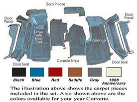 1988-1989 Mass Back carpet sets feature the same hard-rubber backing used by the factory to reduce heat and noise in your Corvette. All Carpet sets include molded heel pads, serged bindings and Velcro strips to hold the floor mats in place and door panel carpet strips.