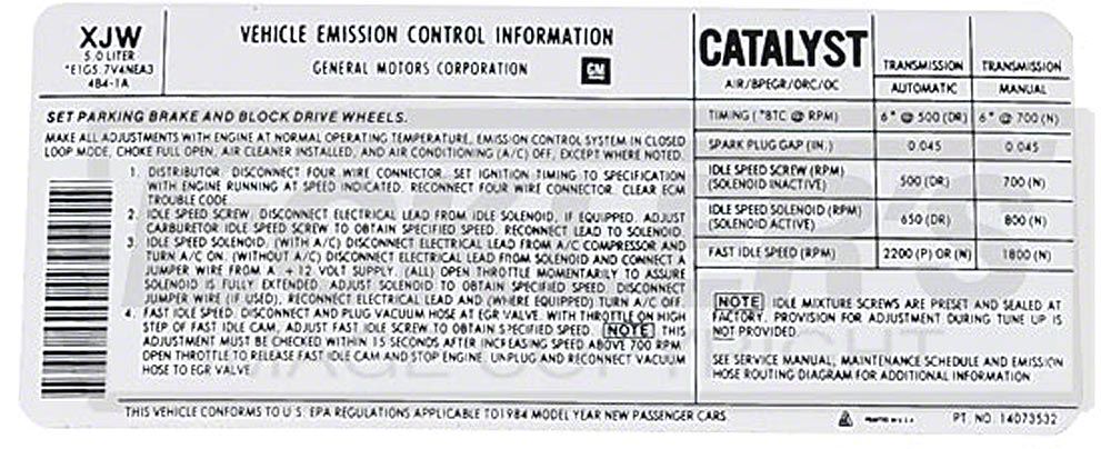 1984 El Camino & GMC Sprints sold in California and New York came factory with certain smog requirements including a visible emissions decal under the hood. Many states now have adopted California and New York standards above Federal standards setting the bar that much higher requiring in many cases clear display of these labels and decals. All 1971 and newer El Caminos have emissions labels or decals showing that they were manufactured to meet either California or U.S. Federal standards. This 1984 XJW El Camino emissions label or decal is affixed in the engine compartment or in a readily accessible location. At the top of this El Camino Emissions label are the words VEHICLE EMISSION CONTROL INFORMATION and the corporate name or trademark of the GM.