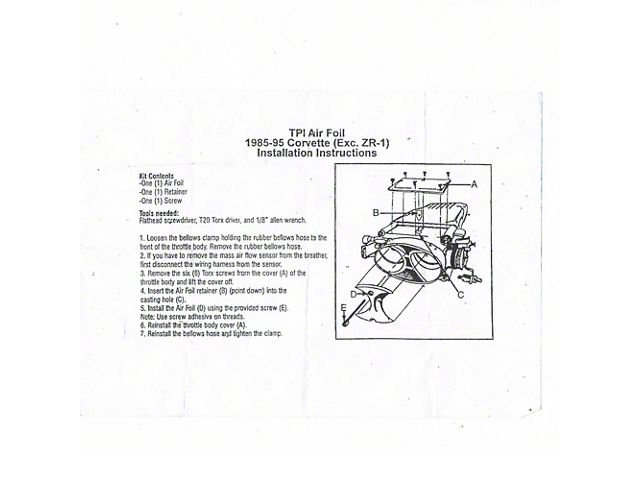 Throttle Body Air Foil reshapes the air as it enters the intake plenum to produce more torque and more horsepower. It adds higher usable RPM and yields 11.8 more horsepower at 4750 RPM. The foil installs into the opening of the throttle body in less than 5 minutes with just one screw and fastener. Modifications to the system are not required, just bolt in.