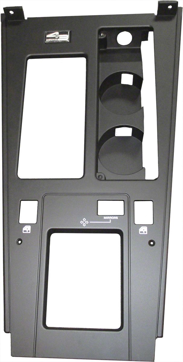 Construction and Appearance. This shifter console trim plate is crafted from durable materials, featuring a matte black finish and clean white icons for a refined appearance. The inclusion of rubber cup door bumpers and tensioned nuts ensures secure installation and long-lasting performance. Built to OE specifications, this part is both compatible and comparable with the original equipment, maintaining the classic look of your vehicle.
