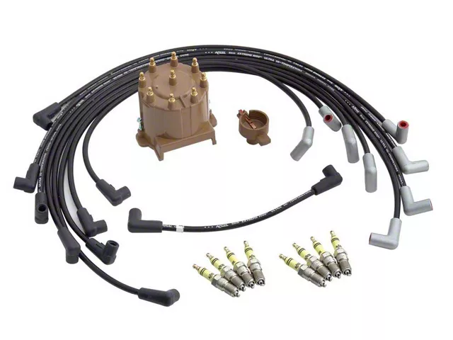 Everything you need to Super Tune Up your truck engine! The kit includes a high performance cap and rotor and a set of 8mm Extreme 9000 Spiral Core wires. This kit also includes the ACCEL classic copper core spark plugs to fire your engine up.