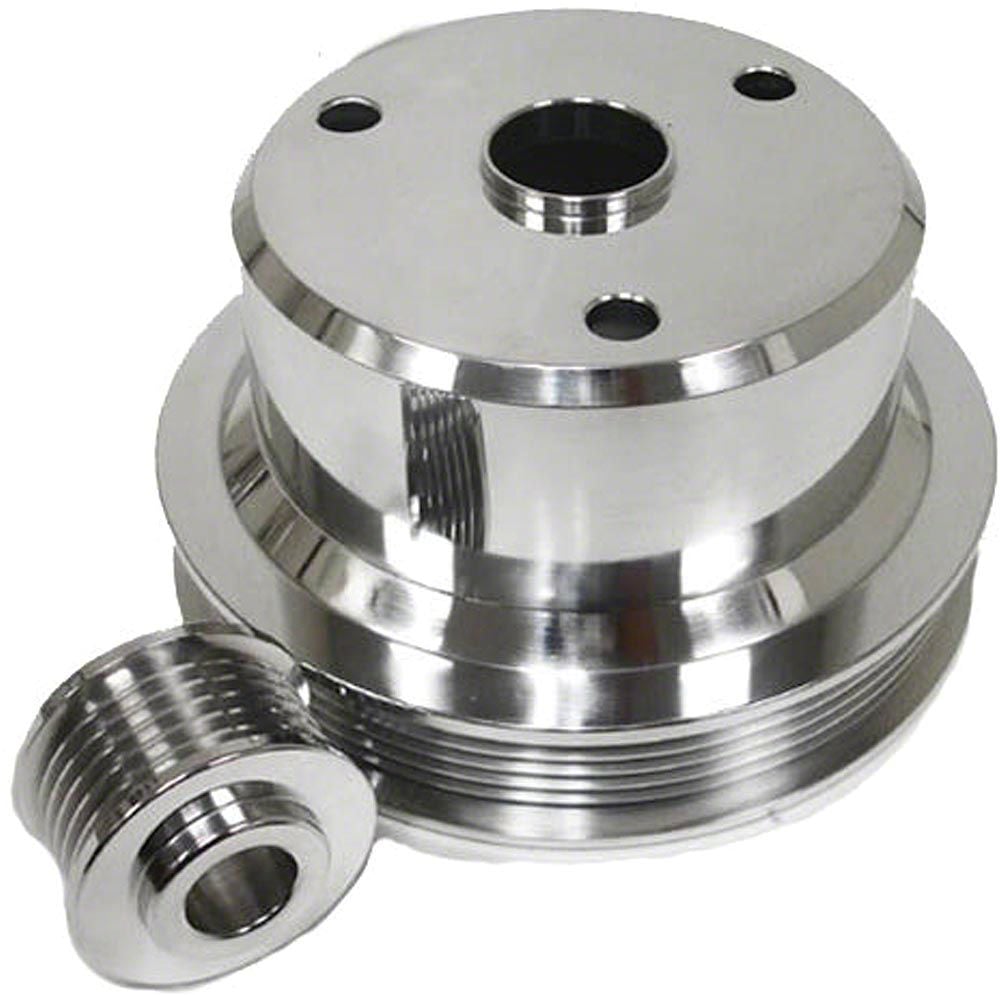 Camaro polished aluminum billet 6 groove serpentine crank and alternator pulleys set. These are for the Camaro set includes crank and alternator pulleys only. Recommended for automatic transmission vehicles. 1988-1992 305-350 Camaro. These pulleys are CNC-machined from the lightest, most durable materials possible, 6061-T6 aluminum billet and polished to a near mirror finish. The crank pulley is 6 7/8" diameter. The Alternator pulley is 1 7/8" diameter.
