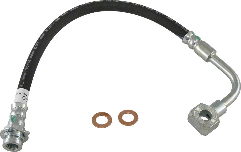 Construction and Appearance. Made from durable, multi-layer reinforced rubber, this brake hose withstands high pressure and heat under braking conditions. Corrosion-resistant steel fittings ensure a secure connection and long-lasting reliability. The hose meets SAE J1401 standards, confirming its quality and safety compliance.