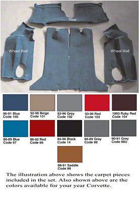 1988-93 Poly Back carpet sets feature the same hard-rubber backing used by the factory to reduce heat and noise in your Corvette. All Carpet sets include molded heel pads, serged bindings and Velcro strips to hold the floor mats in place and door panel carpet strips.